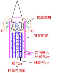 炬管由三層同軸石英管組成,最外層石英管通冷卻氣(Ar氣),沿切線方向引入,并螺旋上升,其作用:將等離子體吹離外層石英管的內(nèi)壁,可保護(hù)石英管不被燒毀;同時(shí),這部分Ar氣同時(shí)也參與放電過程。中層石英管通入Ar氣(工作氣體),起維持等離子體的作用。內(nèi)層石英管內(nèi)徑為1 -2mm左右,以Ar為載氣,把經(jīng)過霧化器的試樣溶液以氣溶膠形式引入等離子體中。