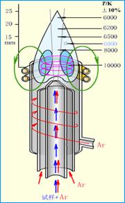 當(dāng)感應(yīng)線圈與高頻發(fā)生器接通時(shí),高頻電流流過負(fù)載線圈,并在炬管的軸線方向產(chǎn)生一個(gè)高頻磁場。若用為電火花引燃,管內(nèi)氣體就會(huì)有少量電離,電離出來的正離子和電子因受高頻磁場的作用而被加速,當(dāng)其運(yùn)動(dòng)途中,與其它分子碰撞時(shí),產(chǎn)生碰撞電離,電子和離子的數(shù)目就會(huì)急劇增加。此時(shí),在氣體中形成能量很大的環(huán)形渦流(垂直于管軸方向),這個(gè)幾百安培的環(huán)形渦流瞬間就是氣體加熱到近萬度的高溫。然后式樣氣溶膠由噴嘴噴入等離子體中進(jìn)行蒸發(fā)、原子化和激發(fā)。