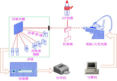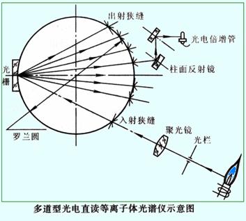 ICP炬管發(fā)射的輻射經(jīng)入射狹縫射到凹面光柵上,經(jīng)色散后,不同波長的光分別聚焦在預(yù)先設(shè)定的,排在羅蘭圓上不同的得出射狹縫上,然后由反射鏡反射至各自的PMT上。